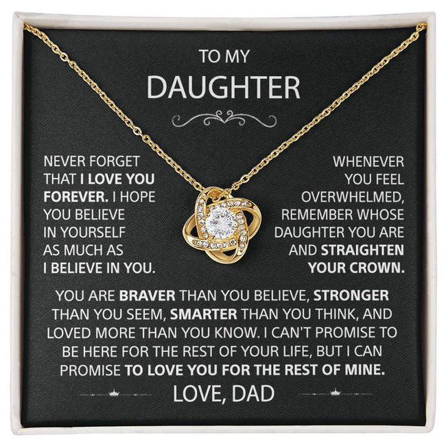 The To My Daughter - Love Knot Necklace is a stunning expression of love and encouragement. Crafted with care, this necklace features a beautifully designed love knot pendant that symbolizes the eternal connection between you and your daughter.