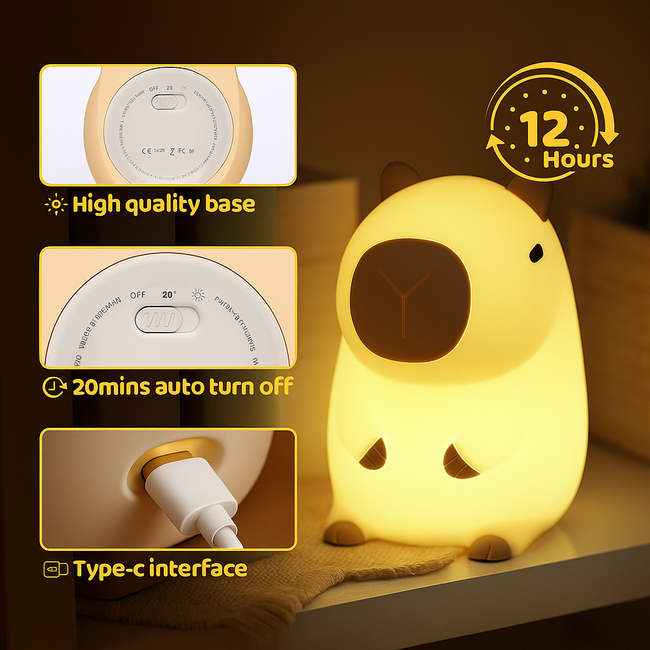 - Touch & Squeeze Control:Ā Effortlessly switch between brightness levels by simply patting or squeezing the capybara.